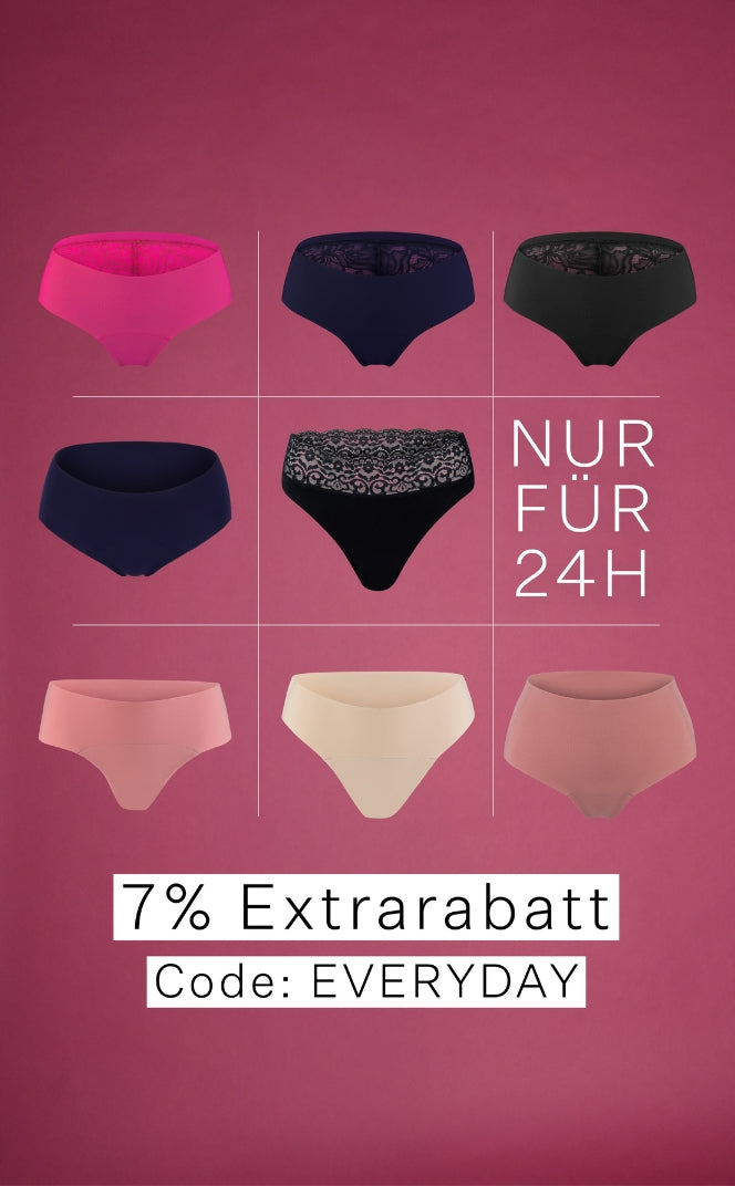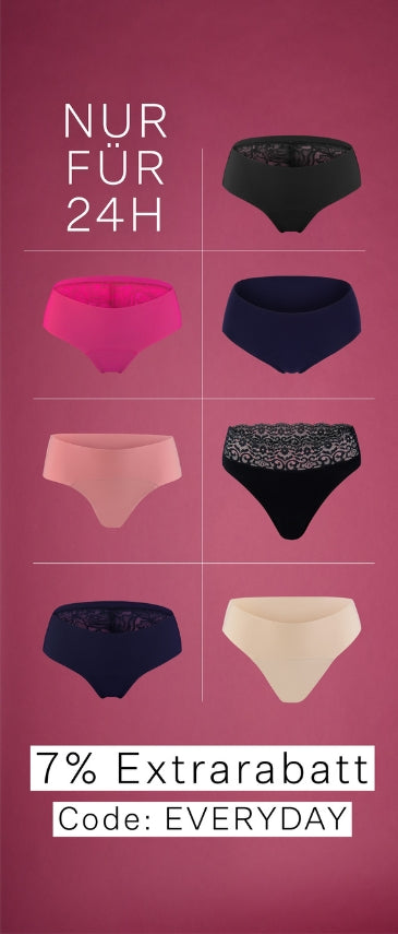 So schön und bequem wie deine Lieblingsunterwäsche, aber sie kann noch viel mehr: Unsere Everyday Collection hat im Schritt einen innovativen und exklusiv für uns entwickelten Innenstoff aus softer Baumwolle eingearbeitet, welcher Slipeinlagen ersetzen kann. Er leitet Feuchtigkeit wie Schweiß, Ausfluss oder leichte Schmierblutungen schnell vom Körper weg, sodass du dich jederzeit trocken fühlen kannst. Die äußere Schicht ist eine flüssigkeitsundurchlässige, aber atmungsaktive Membran, die dich vor dem Auslaufen schützt.