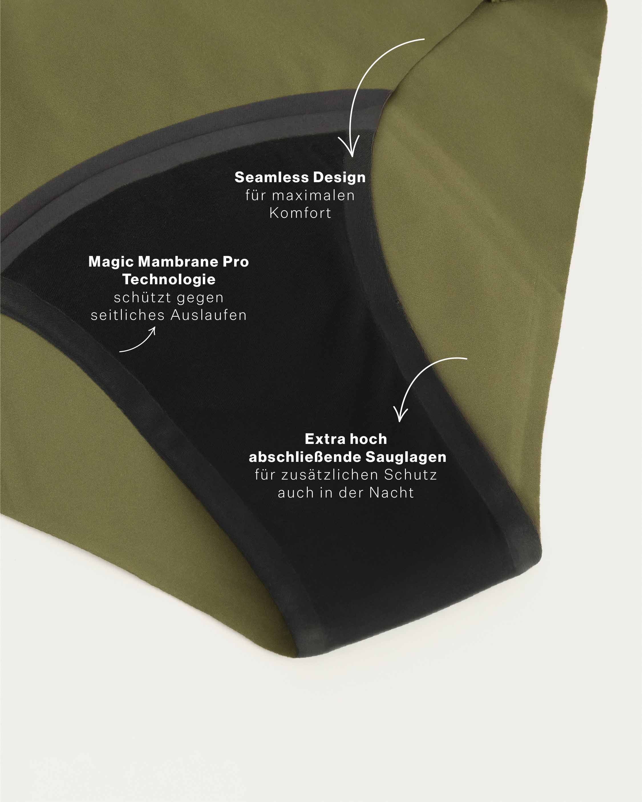 Der Slip Seamless Ultimate hält auslaufsicher bis zu 10 Tampons an Flüssigkeit und fühlt sich dabei komplett trocken an. Dadurch ist er ideal für deine starken Periodentage. Das saugfähige Membransystem endet beim Slip Seamless Ultimate erst hinten am Bund für extra Schutz auch im Liegen. Dies kannst du auf dem Foto der Rückansicht gut erkennen. Außerdem ist der Slip Seamless Ultimate waschbar und damit wiederverwendbar. Den Slip Seamless Ultimate kannst du alleine oder als Back-up zu anderen Periodenprodukten tragen.