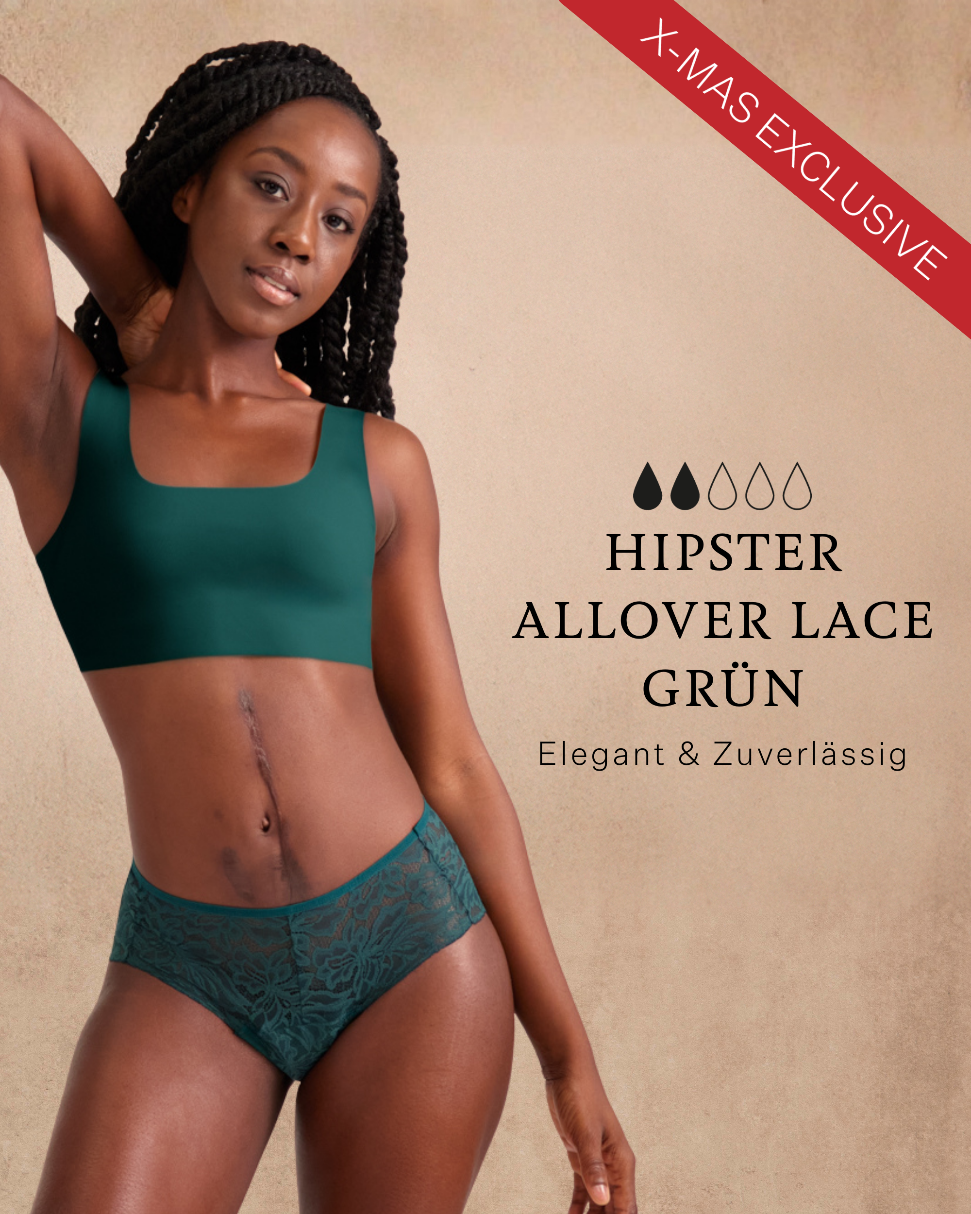 Hipster Allover Lace Grün:Unser Hipster Allover Lace in elegantem Dunkelgrün vereint Komfort mit luxuriöser Spitze und hält auslaufsicher bis zu zwei Tampons an Flüssigkeit. Er fühlt sich dabei komplett trocken an und ist ideal für deine leichten bis mittleren Periodentage.