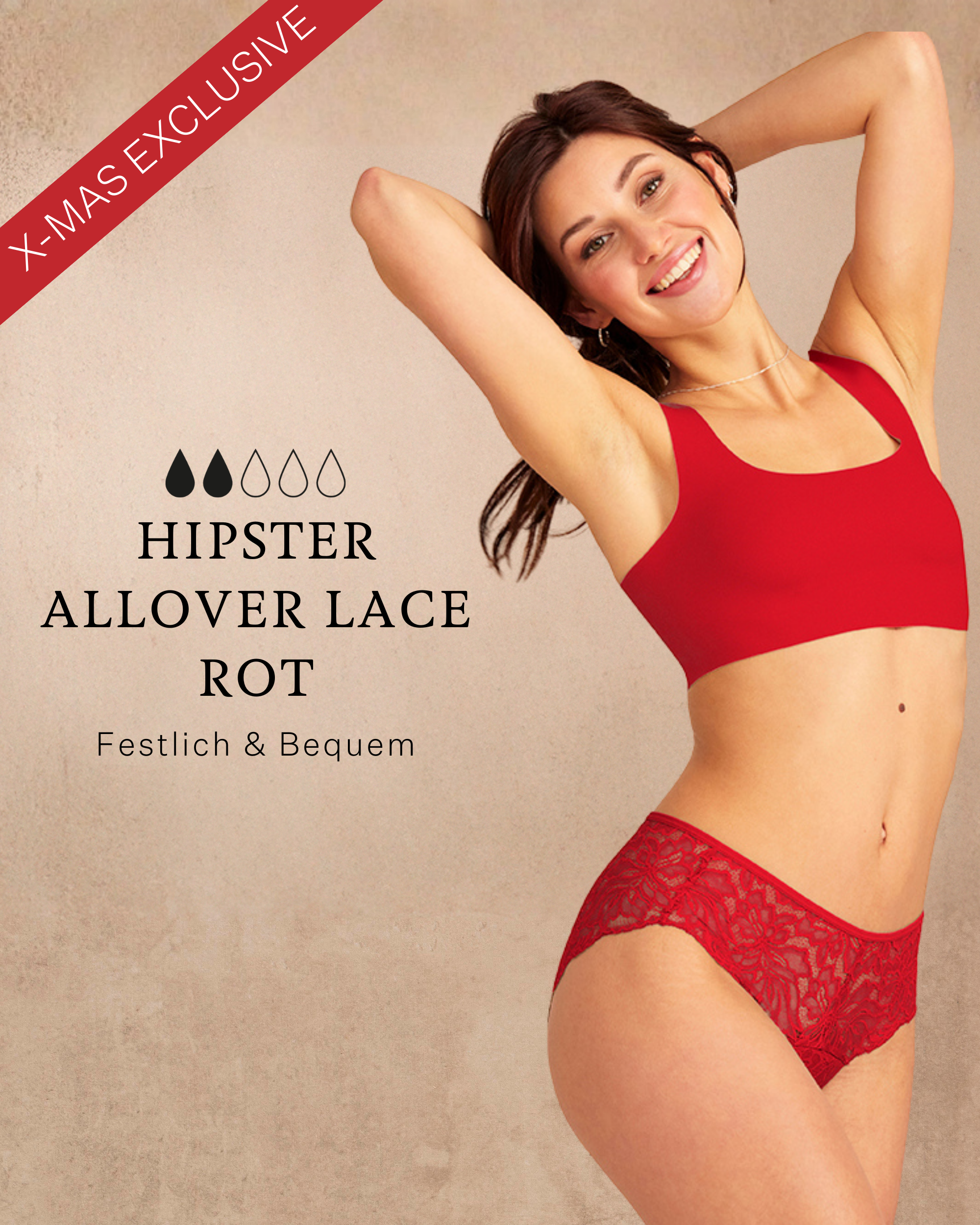 Hipster Allover Lace Rot: Auch dieser Periodenslip bietet zuverlässigen Schutz bis zu zwei Tampons und überzeugt gleichzeitig mit einem sinnlichen, angenehmen Tragegefühl. An leichten bis mittleren Periodentage, macht er deine Tage nicht nur sicher, sondern auch besonders stilvoll.